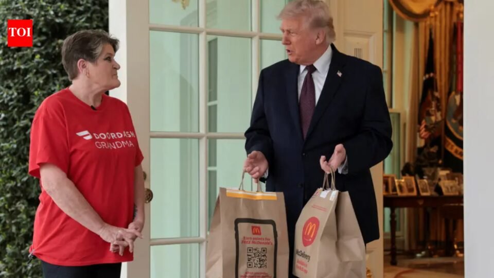 US President Donald Trump had lunch delivered to the Oval Office on Monday afternoon (US local time) when a driver from DoorDash brought two bags of McDonald’s.The worker, identified by the company as Sharon Simmons, hand-delivered the food to the commander-in-chief on the colonnade outside the West Wing.As the delivery unfolded, Trump said, “This doesn’t look staged,” while receiving the food and speaking with reporters gathered outside the White House.Trump then addressed reporters alongside the driver, speaking about his “One Big Beautiful Bill” and “No Tax on Tips” initiative for American workers, with the filing deadline for most Americans two days away.When asked whether the driver received a good tip, Trump reached into his pocket and gave her a $100 bill. The brief delivery soon turned into an impromptu press event. Reporters were brought to the front door of the White House as Trump continued speaking on a range of topics, including Iran, while the US began a blockade of Iran’s ports and the Strait of Hormuz. He also spoke about his conflict with the Pope.In one exchange, Trump turned to the worker and asked her about “men in women’s sports.” She responded, “I really don’t have an opinion on that. No, no, I’m here on no tax on tips.”